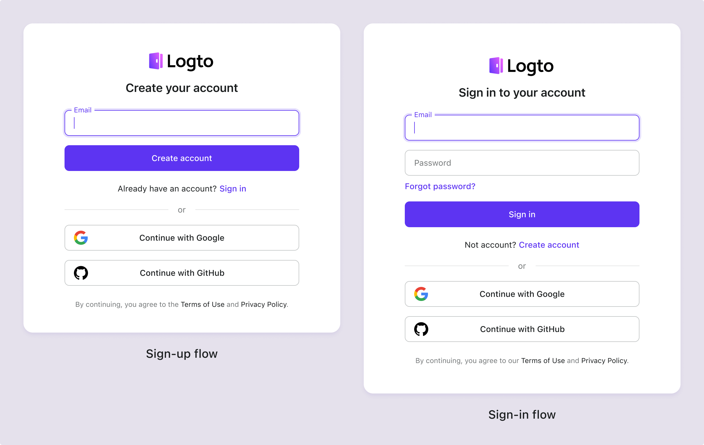 Quando os usuários usam pela primeira vez o registro social (por exemplo, Google ou GitHub), um pop-up solicitará que eles consintam com os Termos e Políticas de Privacidade após serem redirecionados para o Logto. Este consentimento não é necessário para logins sociais subsequentes.